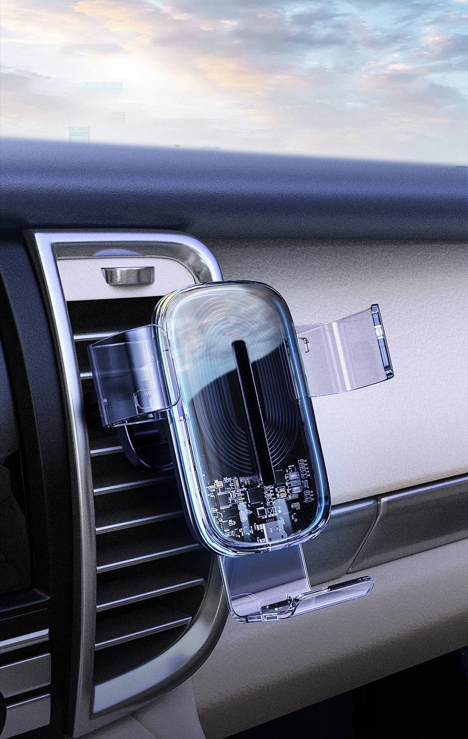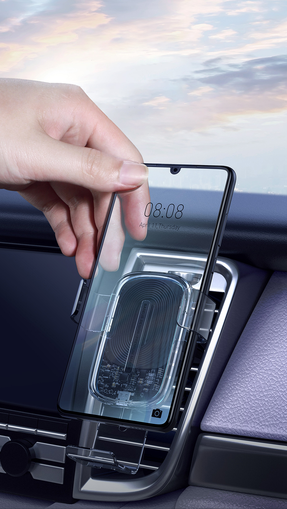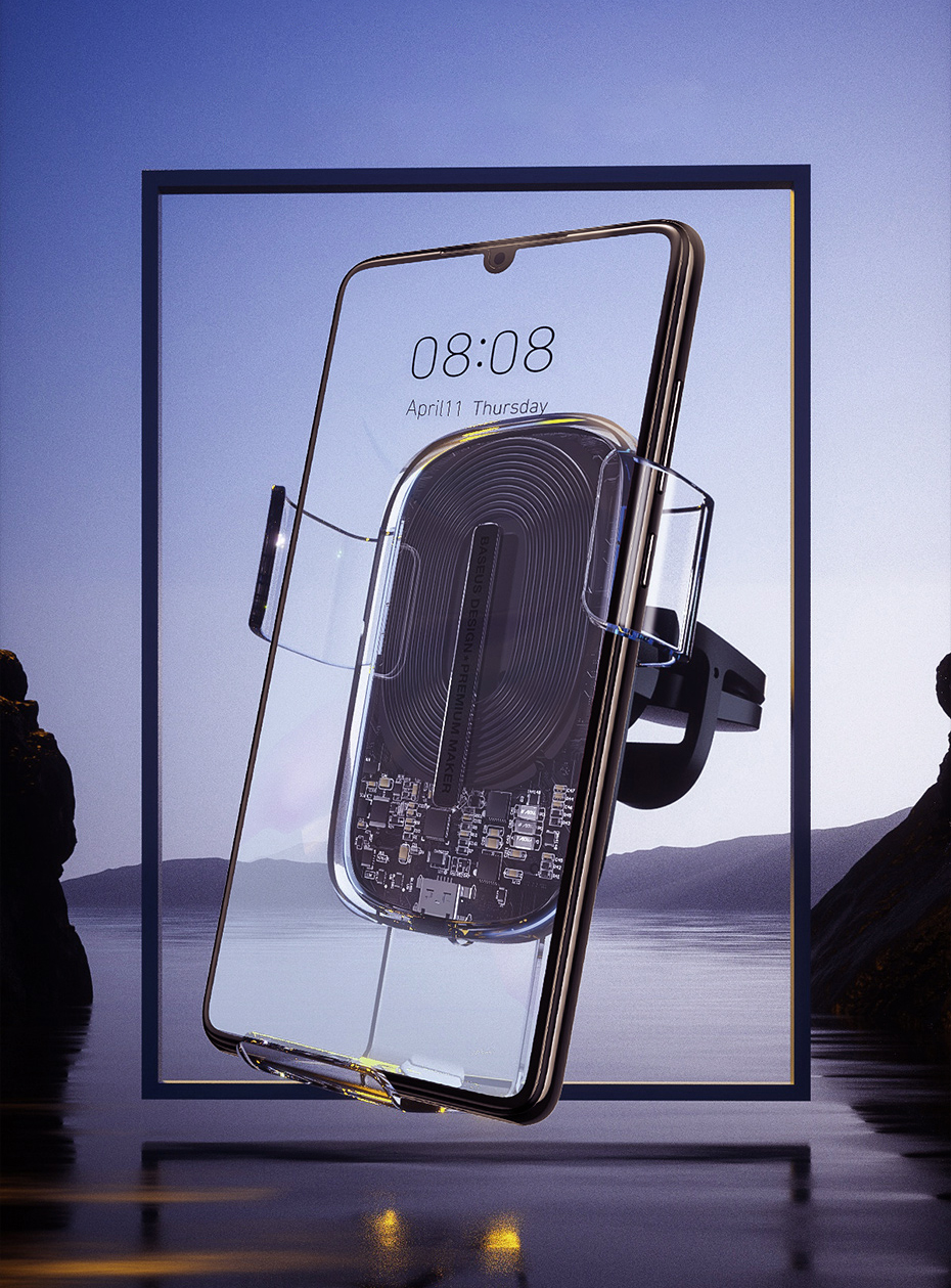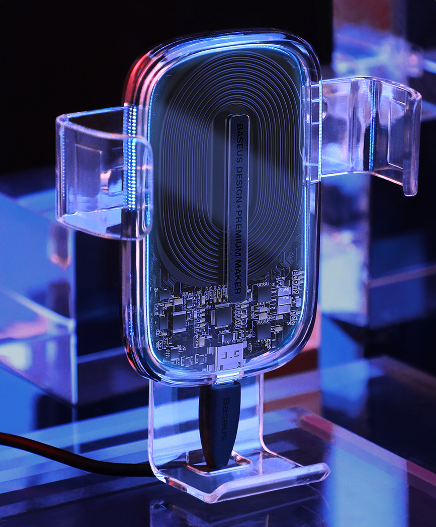 Wireless phone holder, with the ability to charge the phone while using navigation or watching movies. The new, transparent design will give your vehicle an additional style and will guarantee safety and stability. It has a gravitational sensor.
