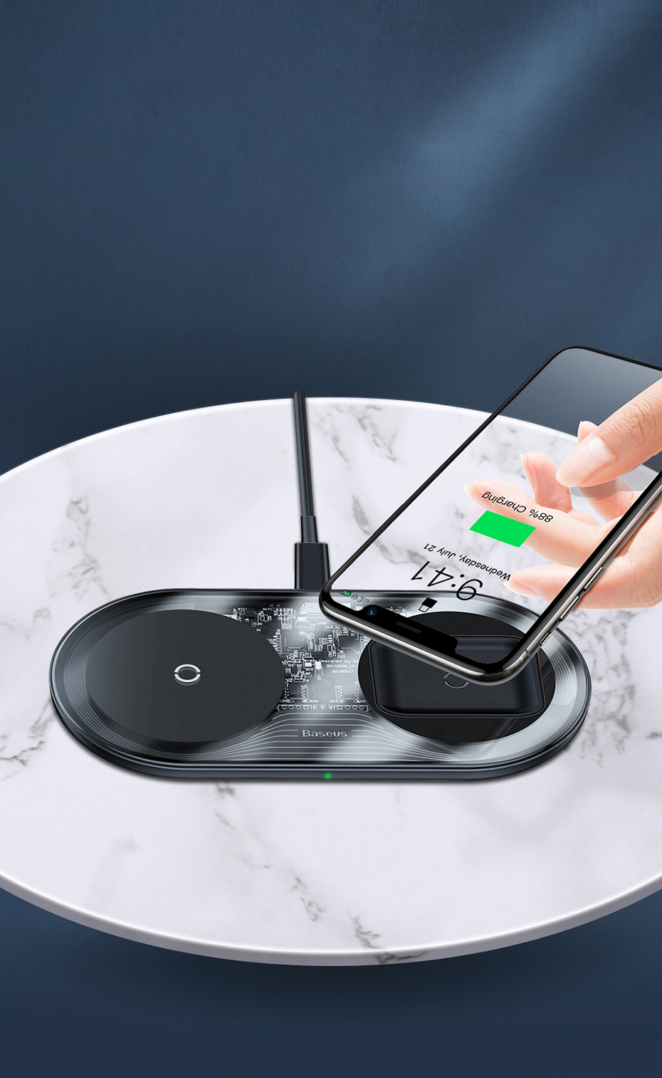 The transparent induction charger, with its 15W power, allows you to quickly charge two devices at the same time, available in different colors: black, white, and with a transparent front panel.