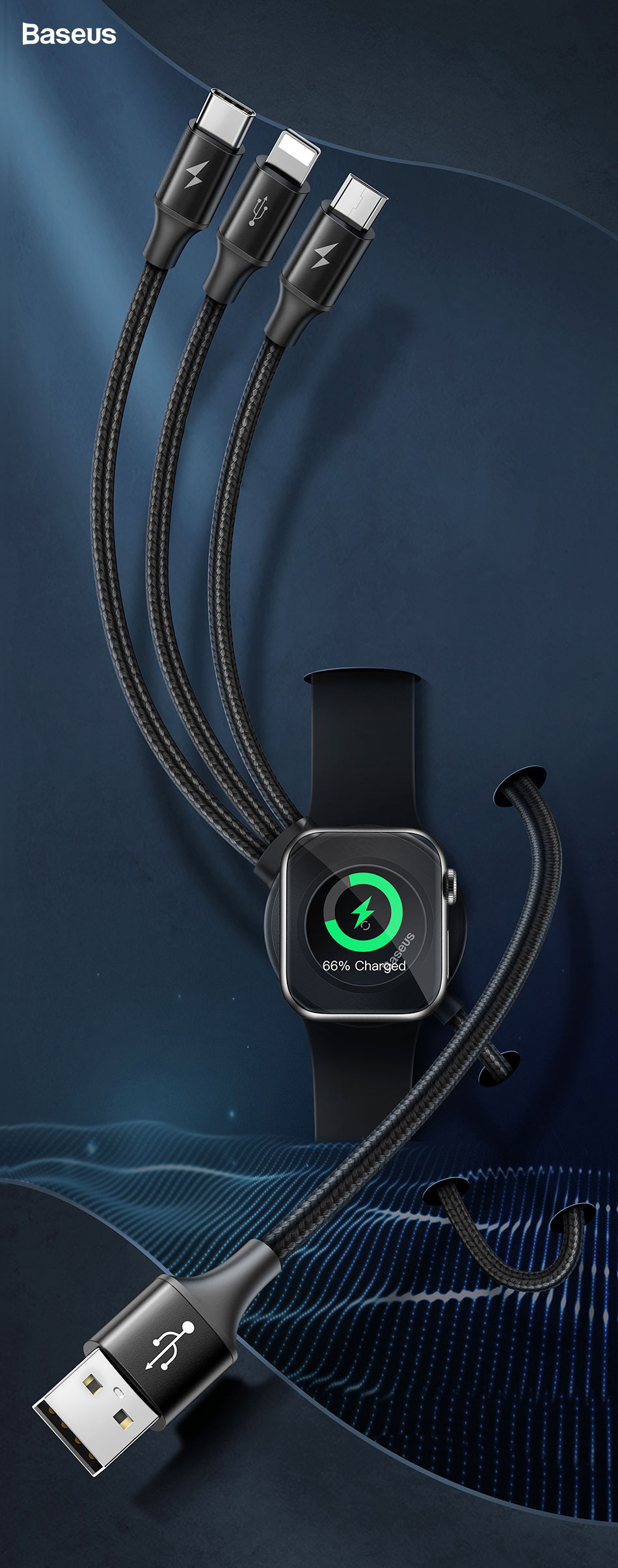 If you have a lot of cables in your house and it's a real annoyance to find and match each one to different devices, the new Baseus cable is the cure for your problems. This cable has an Apple Watcha Induction Charger and 3 cables with different ends: Lightning, micro USB, and USB-C.