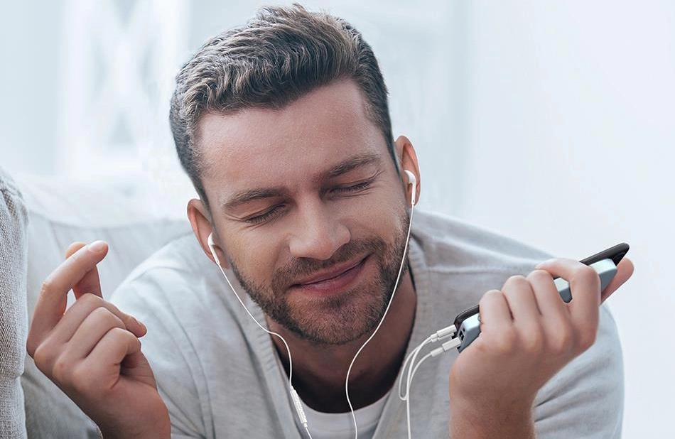 The case has a built-in adapter, so you can listen to music while charging your smartphone. With this case we do not need an external audio adapter, we always have 2 lightning sockets.