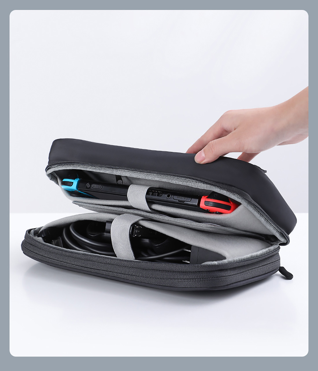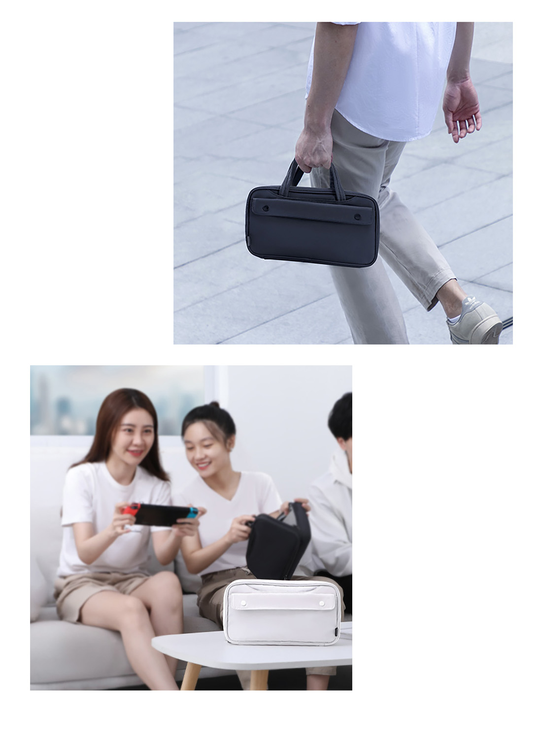 The Baseus bag gives you the opportunity to quickly increase its capacity. All you have to do is unfasten the lock and you already have much more space at your disposal! With a standard arrangement you can fit a console and a few accessories into the bag - this practical and lightweight solution will work perfectly every day. The increased capacity allows you to pack up the Switch, the docking station and all the accessories you have - take them when you go on vacation or want to provide entertainment for meeting yourself and your friends. No more wondering what to take with you on a trip - Baseus will let you take everything!