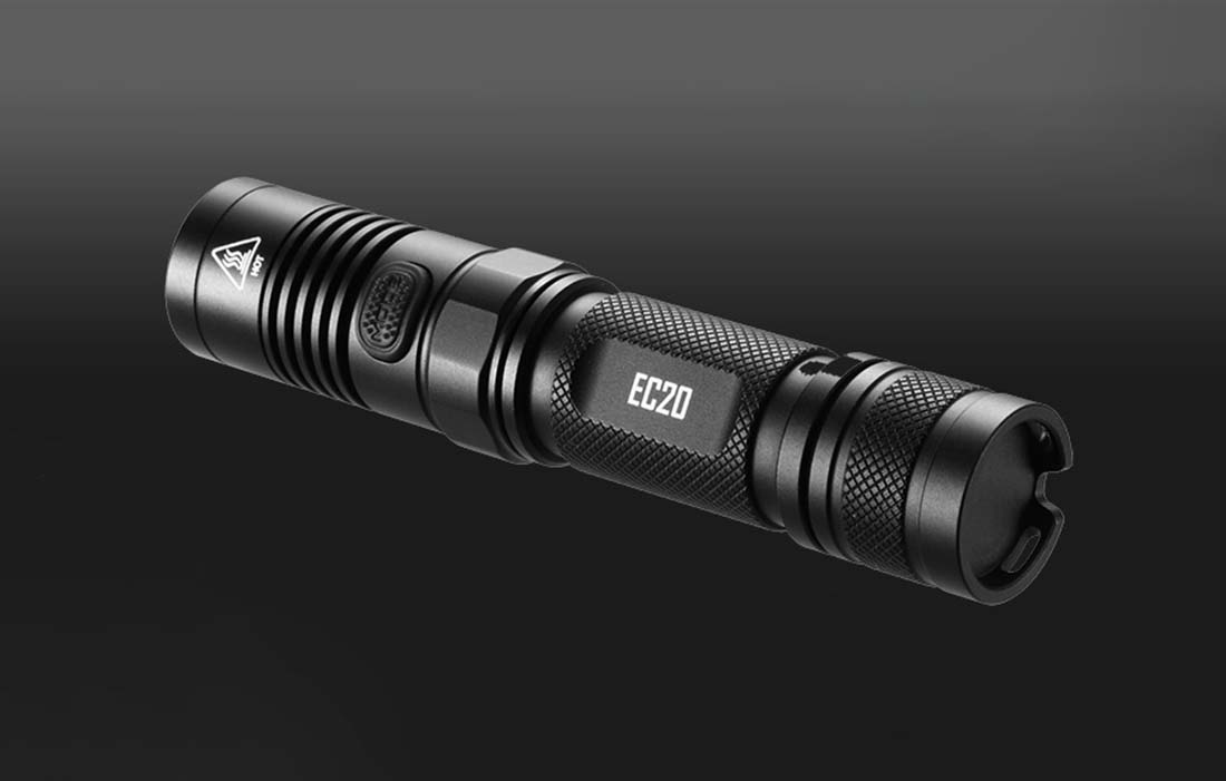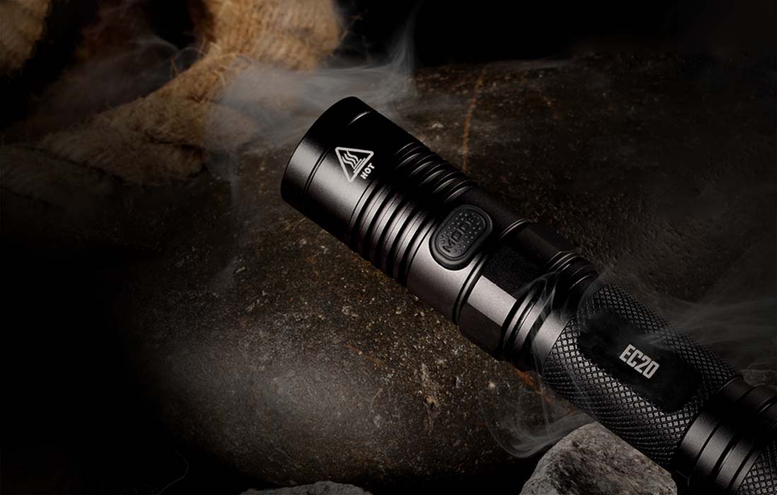 The device was created from aircraft-grade aluminum alloy and finished using a hard anodizing process (HA III military standard). It is extremely durable and resistant to damage. Even a fall from a height of up to 1m will not harm it. The gold-plated contacts are protected from oxidation to maximize performance and extend the life of the flashlight. The EC20 is also IPX8 waterproof. You can immerse it up to 2m without worry.