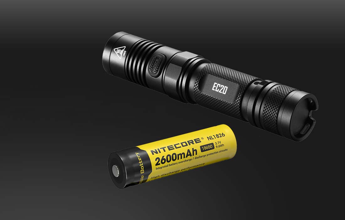 You will need one 18650 or two CR123 batteries (not included) to power the flashlight. The EC20 can run up to 520 hours at the lowest brightness level (Ultra-low, 1lm). This gives you more than 21 days! The device has also been protected against reverse polarity. It also has a built-in light indicator that will flash to let you know when the power level reaches 50% or drops below. It will also indicate the battery voltage.
