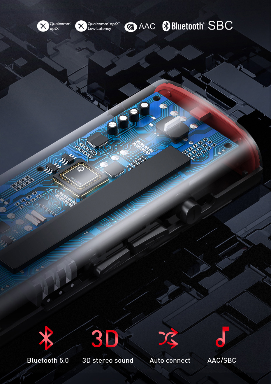 The receiver uses the latest Bluetooth 5.0 technology, emits 3D sounds and automatically pairs with your mobile device. Enjoy original sound quality with aptX technology.