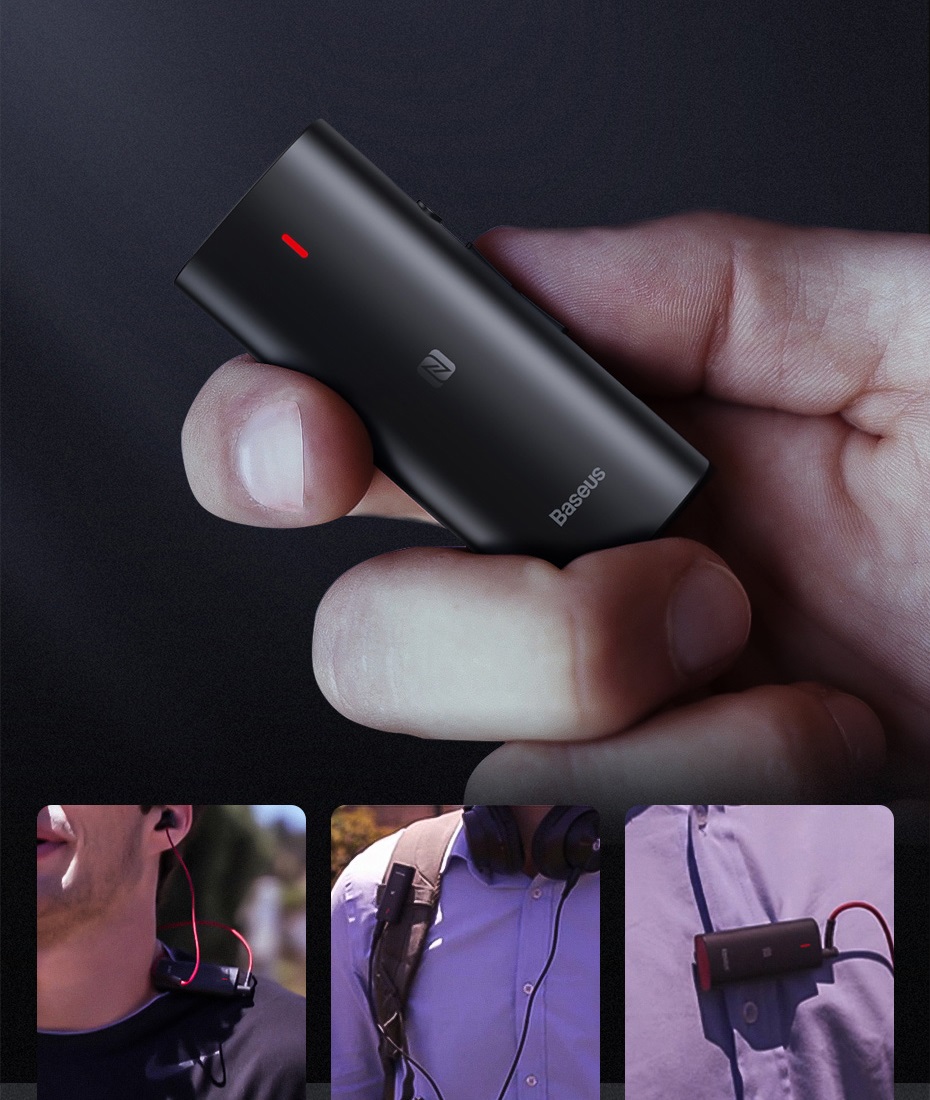 The Baseus Bluetooth receiver is extremely compact. It weighs only 150 grams, so you can always have it with you. It can even fit in a small backpack or purse pocket. The clip allows you to mount the device conveniently anywhere, and LEDs indicate the battery charge level.