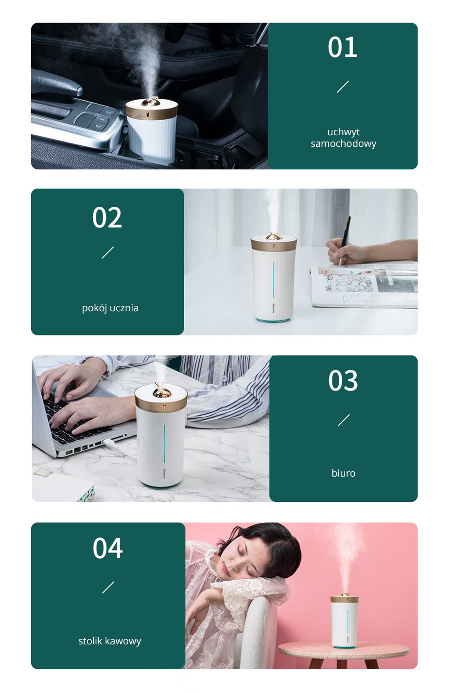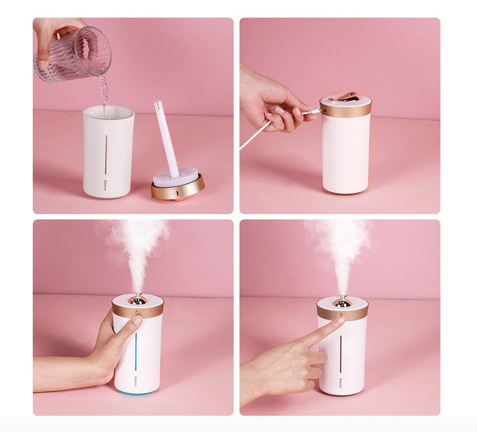 The Baseus Humidifier will work perfectly in any place. You can take it with you to the university, to work, car, or use it at home and not worry about dry air.