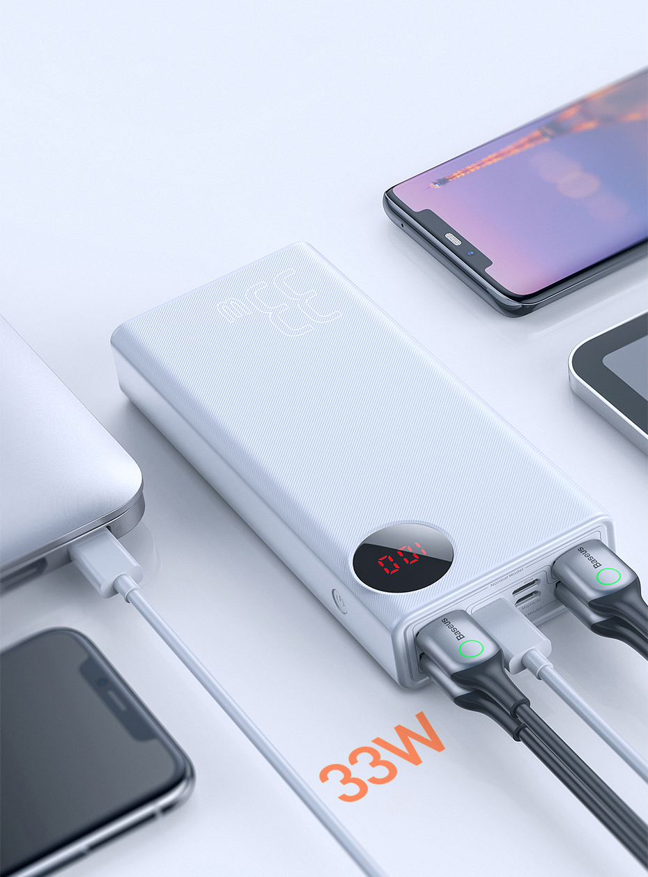 Extremely capacious power bank Baseus, with 33W of power and a large capacity of 30 000mAh. It supports QuickCharge and PD technology, has an LED display and 5 outputs. It will be perfect not only for traveling but also for everyday use.
