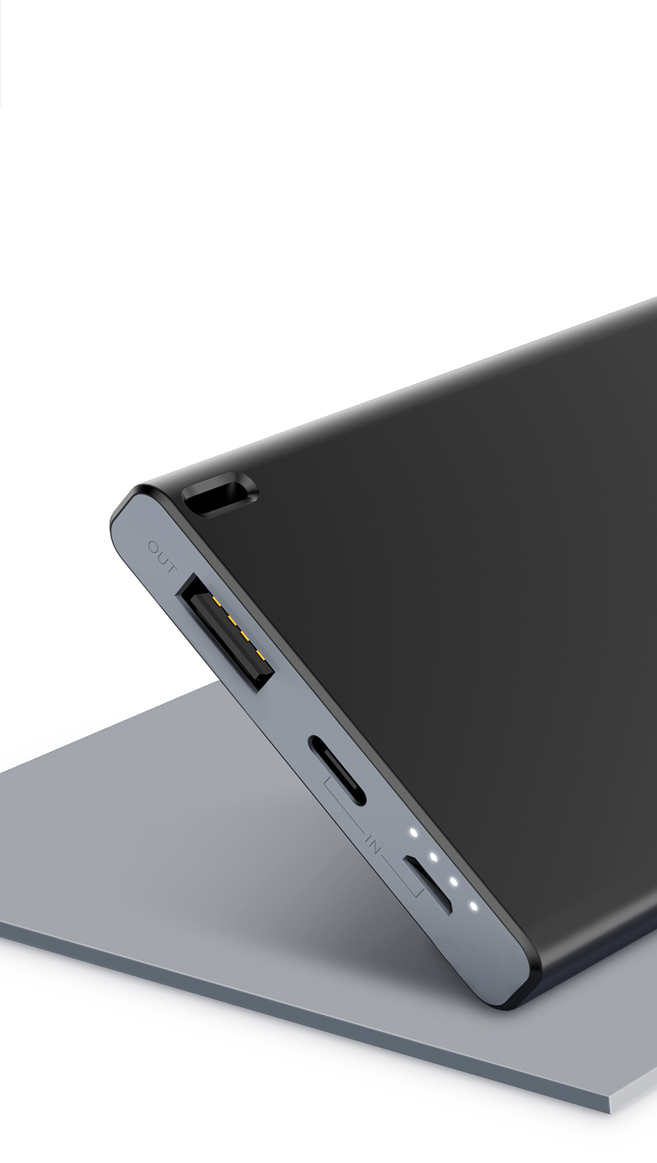 The device's charge status is indicated by 4 LED lamps located at the micro USB port, so you will always know when the power bank needs charging.
