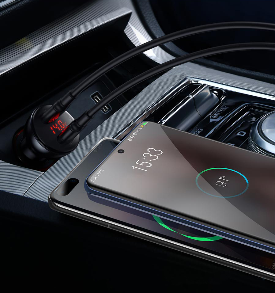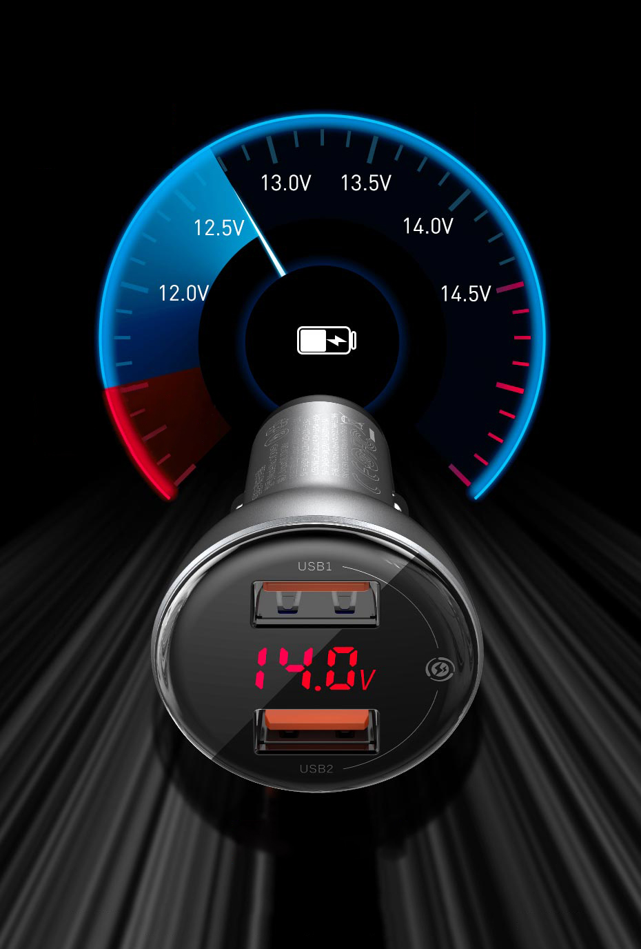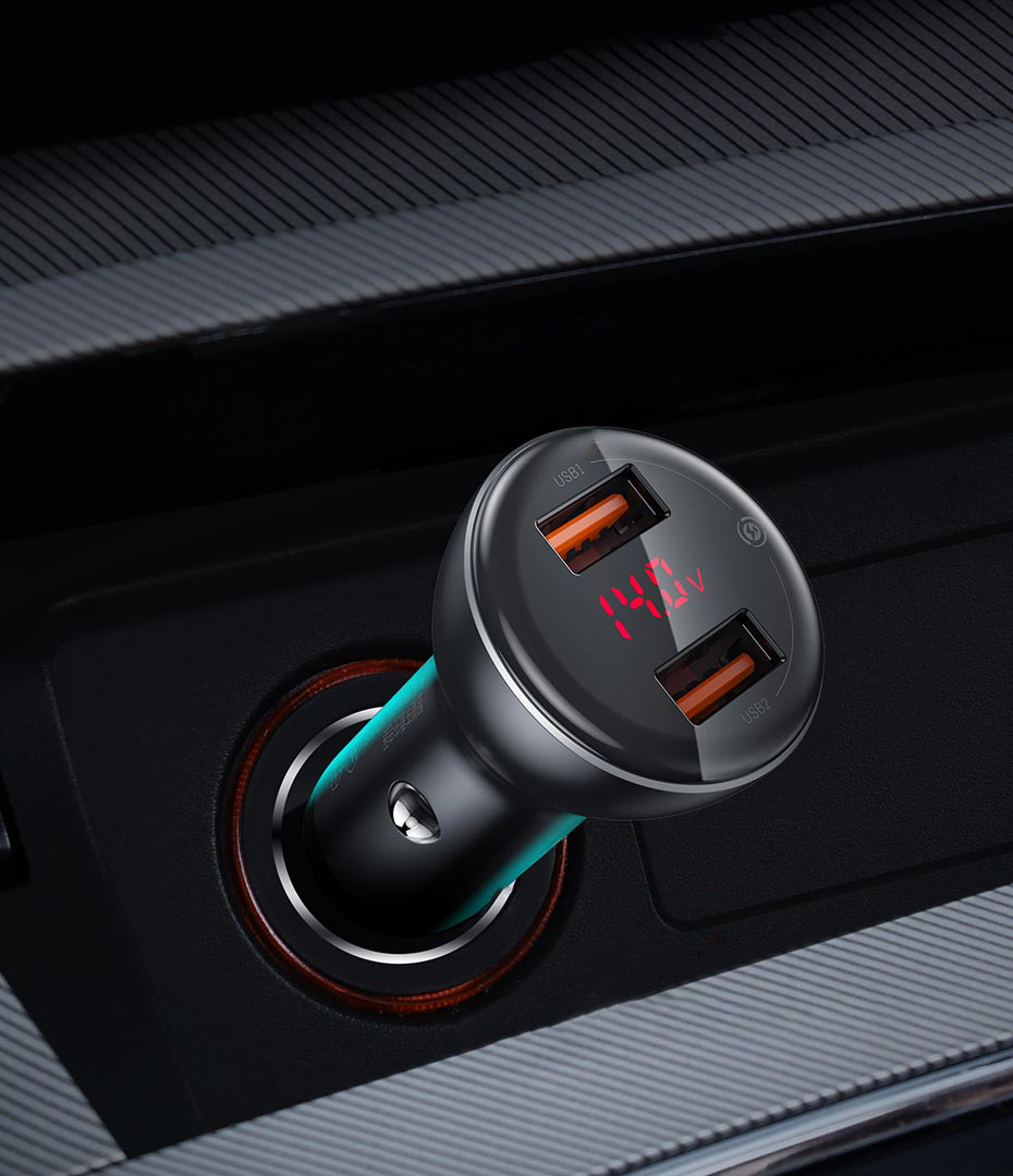 The display on the charger indicates the current-voltage in the car. The device is compatible with cars from 12 to 24 volts.
